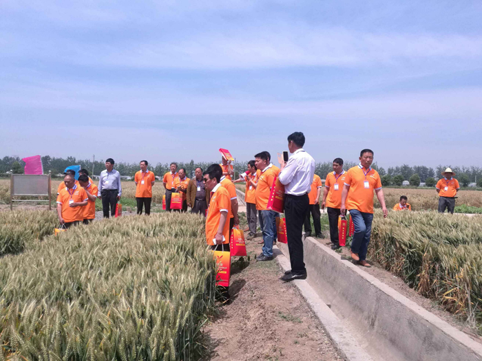24日上午10點,觀摩活動正式開始,來自蘇北區域的經銷商團隊們在睢寧基地的谷成林老師和常規稻麥部片區經理汪鵬程的帶領下,走進淮麥33原種繁殖田,近距離觀察淮麥33的長勢長相,同時常規稻麥部副經理韓國標深入講解我公司對淮麥33提純復壯所做出的努力及取得的成績。淮麥33,植株矮壯,第一節間短,秸稈厚實、抗倒能力強,長相清秀、穗頭大,分蘗能力強、抗寒性好等一系列優良特點。與會人員紛紛表示淮麥33的優點非常突出,每穗粒數和千粒重也都非常高,豐產潛力性強。觀摩活動結束后,參會人員排著整齊的隊伍齊聚廣場大聲高呼“要想糧食堆成山,就種淮麥33。”的響亮口號,將現場氣氛推向高潮。