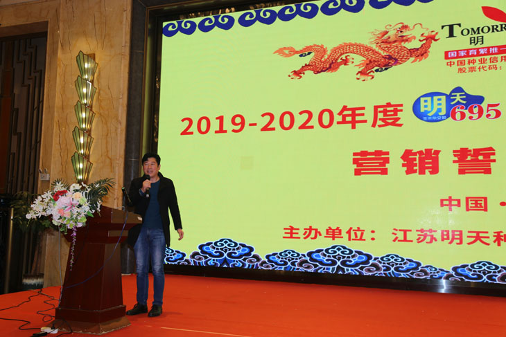 本次大會(huì)中,江蘇明天種業(yè)嚴(yán)輝民總經(jīng)理就《江蘇明天種業(yè)發(fā)展戰(zhàn)略》進(jìn)行了介紹。嚴(yán)總圍繞“一個(gè)平臺、二大市場、三個(gè)階段、四大板塊、五大體系建設(shè)”詳細(xì)介紹了明天種業(yè)的過去、現(xiàn)在和未來。通過嚴(yán)總詳細(xì)的介紹,讓參會(huì)的經(jīng)銷商對明天種業(yè)有了一個(gè)全新的認(rèn)識和了解。嚴(yán)總說:成功伴著艱辛,喜悅伴著汗水,“明天695”在過往的一年里,因有“明天695”家人們的努力推廣,使“明天695”取得了一定成績;因有“明天695”家人們相伴,使“明天695”得到了廣大農(nóng)戶的青睞;因有“明天695”家人們砥礪前行,使我們斗志昂揚(yáng)!更有“明天695”家人們與江蘇明天種業(yè)攜手共進(jìn),“明天695”的推廣必將譜寫精彩!堅(jiān)持夢想,篤定前行,2019-2020年度,“明天695”注定會(huì)是一個(gè)豐收年,希望“明天695”家人們繼續(xù)跟隨江蘇明天種業(yè)的步伐,共同努力,開創(chuàng)新的未來。昨天,我們一同揮灑汗水,點(diǎn)點(diǎn)滴滴,鑄就“明天695”輝煌的成績;今天,我們一同揮灑汗水,朝朝暮暮,成就者“明天695”美好的未來;明天,讓我們一同揮灑汗水,去開拓“明天695”更加燦爛的明天。