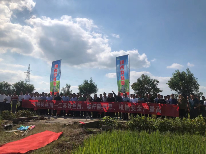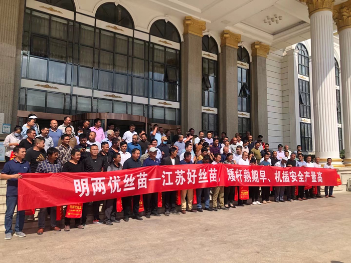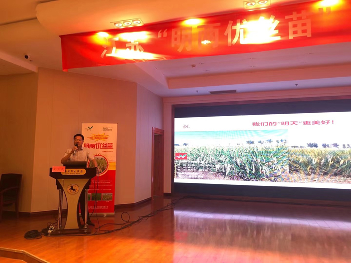 接著由泗陽縣種植大戶就明兩優絲苗在泗陽種植、品種田間表現、肥料運籌情況作了詳細分享。種植戶認為明兩優絲苗:第一、熟期早特別適合江蘇淮河以北機插、沿淮直播,第二、株高矮、株型緊湊、抗倒性強,第三抗病性強,示范及種植四年田間無病害。是一個非常具有推廣價值和前景的大品種,同時也是一個淮河以北稀缺的雜交水稻機插合法品種。