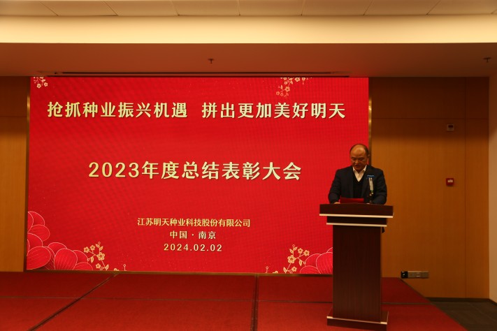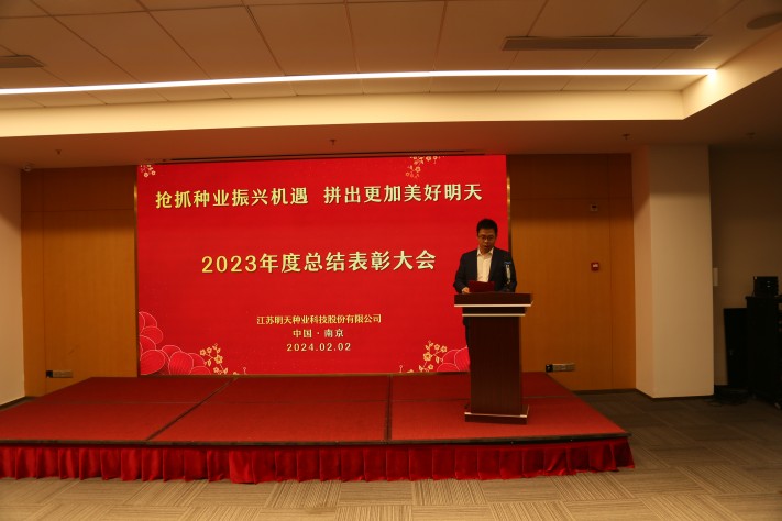 春耕夏耘,秋收冬藏”,22日江蘇明天種業全體人員齊聚南京圣和文化交流中心隆重召開2023年度總結表彰大會。公司全體領導班子成員、2023年度先進和優秀員工代表及子公司員工等160余人參加了會議,會議由公司副總經理胡玉成主持